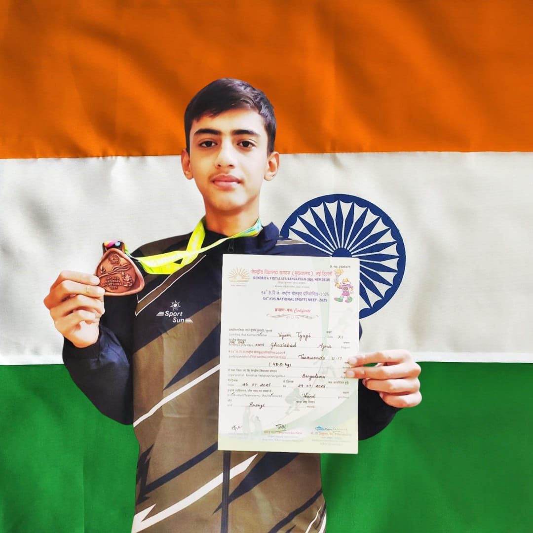 व्योम त्यागी ने बंगलौर में “केवी नेशनल गेम्स “में मैडल जीतकर किया जिले का नाम रोशताइक्वांडो में जिले के 16 वर्षीय उभरते हुए खिलाड़ी व्योम त्यागी ने बंगलौर में 25 से 29 जुलाई तक आयोजित केंद्रीय विद्यालय संगठन राष्ट्रीय खेल कूद प्रतियोगिता 2025 में ताइक्वांडो की प्रतियोगिता में अंडर 17 के 51 किलोभार वर्ग में शानदार खेल का प्रदर्शन करते हुए लगातार तीसरे साल ब्रोंज मेडल जीतकर प्रदेश और गाजियाबाद जिले का नाम रोशन किया है इससे पहले रीजनल गेम्स में गोल्ड मेडल हासिल करने पर व्योम त्यागी का चयन के.वी नेशनल गेम्स के लिय हुआ था