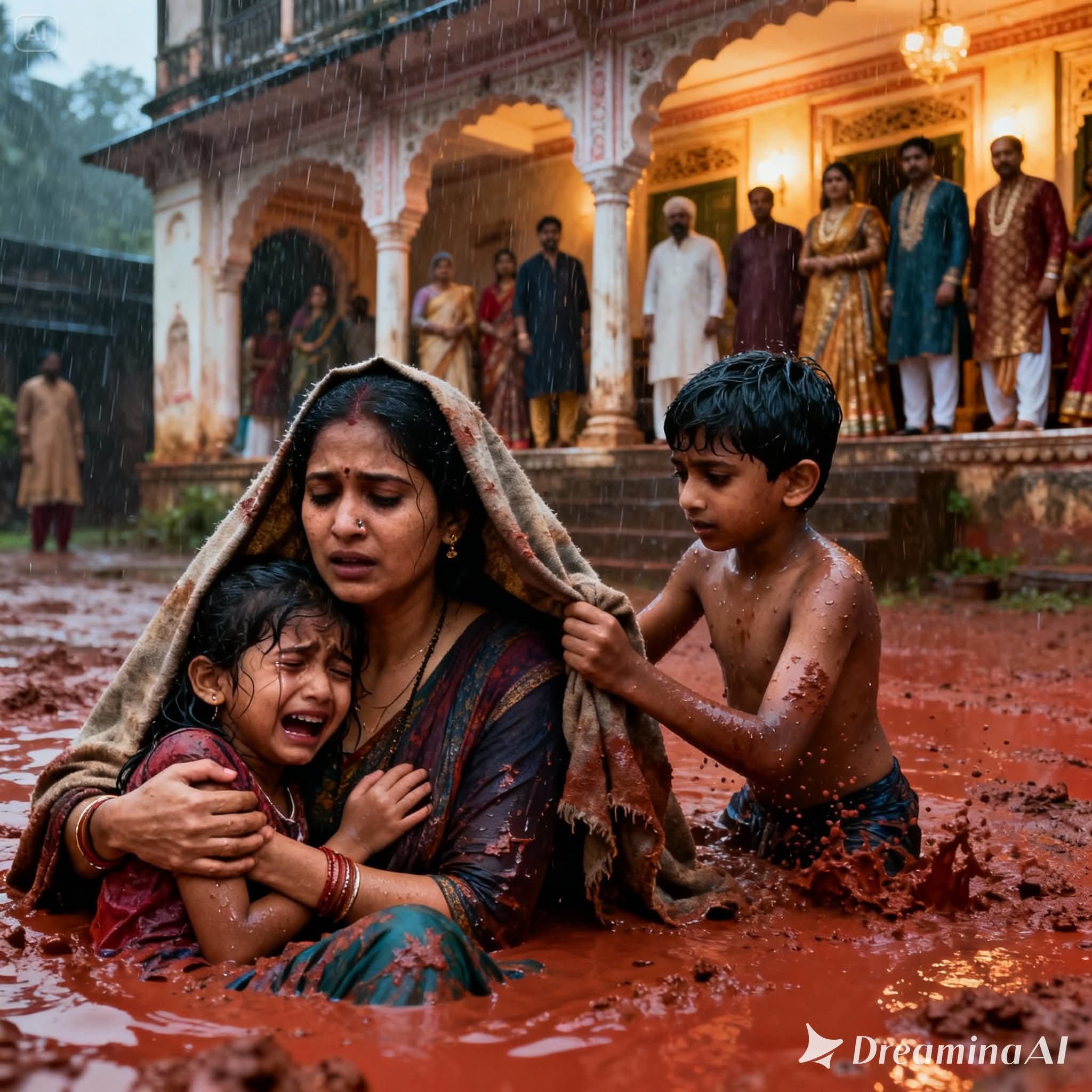 पत्थर से बने हवेली के पोर्च से, नक्काशी वाले मेहराबों के नीचे और पीतल के लालटेन की गर्म रोशनी में, राघव और सुषिला हमें देख रहे थे। उनके आंखों में कोई दया नहीं थी। वे गर्व और परंपरा की प्रतिमाएँ थे। बुजुर्ग परिवार प्रमुख, अपनी साफ़ कुर्ता और अलंकृत छड़ी के साथ, हाथ उठाकर तिरस्कार का इशारा किया। यह संकेत था। उनके तीन नौकर, जो कभी अर्जुन के जीवित रहते मुझे सम्मान देते थे, मेरी थोड़ी-सी संपत्ति को कीचड़ में फेंकने लगे।