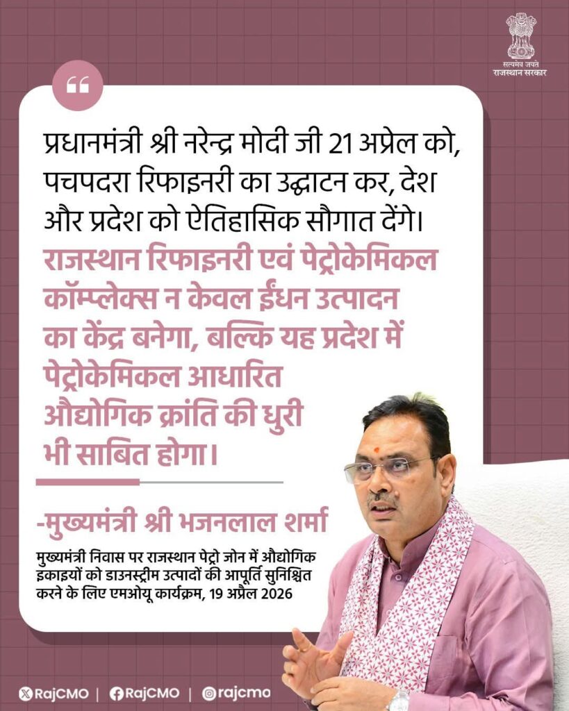 प्रधानमंत्री श नरेन्द्र मोदी 21 अप्रेल को, पचपदरा रिफाइनरी का उद्घाटन कर, देश और प्रदेश को ऐतिहासिक सौगात देंगे। Post navigation कबूतरों को दाना खिलाना पड़ेगा महंगा—सार्वजनिक जगहों पर सख्ती के मूड में प्रशासनजनसेवा के कर्तव्य पथ पर बढ़ते अविराम कदम
